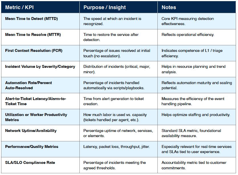 Key performance indicators (KPIs) are real-time metrics that provide visibility into the network’s operational health and performance. They quantify how effectively SLOs are met and drive transparency between the NOC provider and the client.